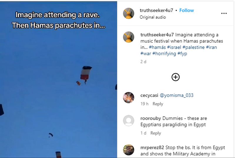 ഇസ്രയേലില് നടന്നുകൊണ്ടിരുന്ന ഒരു സംഗീത പരിപാടിയില് ഹമാസിന്റെ ആളുകള് ആക്രമണം അഴിച്ചുവിട്ടതായി റിപ്പോര്ട്ടുകളുണ്ടായിരുന്നു. ഇതിന് പിന്നാലെയാണ് ഒരു വീഡിയോ സാമൂഹ്യമാധ്യമങ്ങളില് പ്രത്യക്ഷപ്പെട്ടത്. 'ഹമാസിന്റെ പാരച്യൂട്ടുകള് വരുമ്പോള് ഒരു സംഗീത പരിപാടിയില് പങ്കെടുക്കുന്നത് ആലോചിച്ചു നോക്കൂ' എന്ന കുറിപ്പോടെയാണ് ഇന്സ്റ്റഗ്രാമില് വീഡിയോ പോസ്റ്റ് ചെയ്തിരിക്കുന്നത്. 2023 ഒക്ടോബര് 9-ാം തിയതിയാണ് വീഡിയോ ഇന്സ്റ്റയിലെത്തിയത്. സമാന വീഡിയോ ട്വിറ്ററിലും കാണാം.