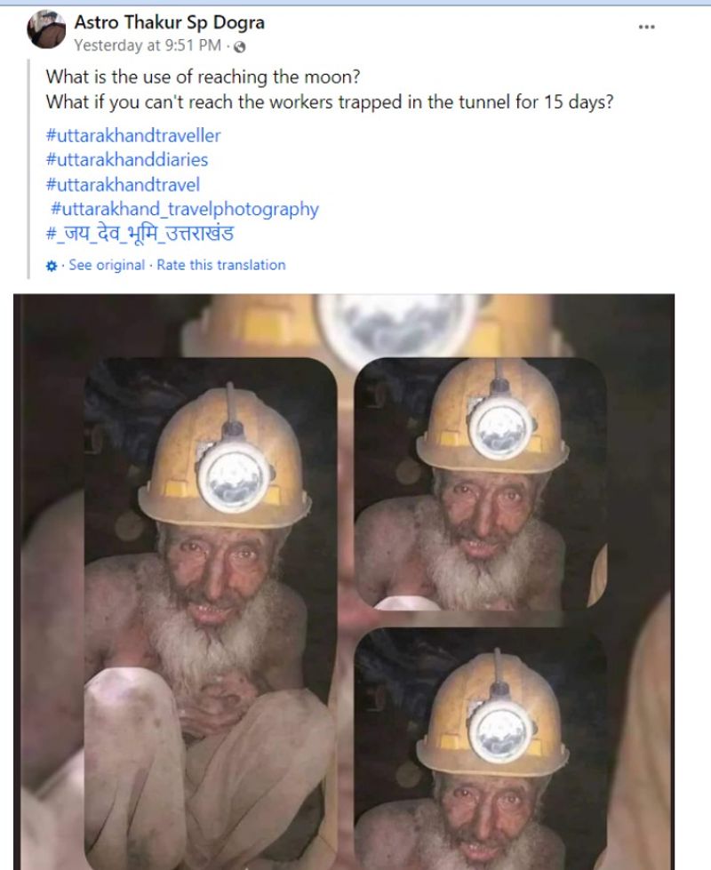 ഉത്തരാഖണ്ഡിലെ സിൽക്യാരയിൽ ടണൽ നിർമാണത്തിനിടെ കുടുങ്ങിയ 41 തൊഴിലാളികളില് ഒരാളുടേത് എന്ന പേരിൽ പ്രചരിക്കുന്ന ചിത്രം വ്യാജം. വയോധികനായ ഒരു മനുഷ്യന്റെ ചിത്രമാണ് സാമൂഹ്യമാധ്യമങ്ങളിൽ പ്രചരിക്കുന്നത്. എന്നാൽ ഈ ചിത്രം 2019 മുതൽ ഇന്റര്നെറ്റിൽ കാണാം. സാമൂഹ്യമാധ്യമങ്ങളില് നടക്കുന്ന പ്രചാരണത്തെ കുറിച്ച് വിശദമായി അറിയാം.