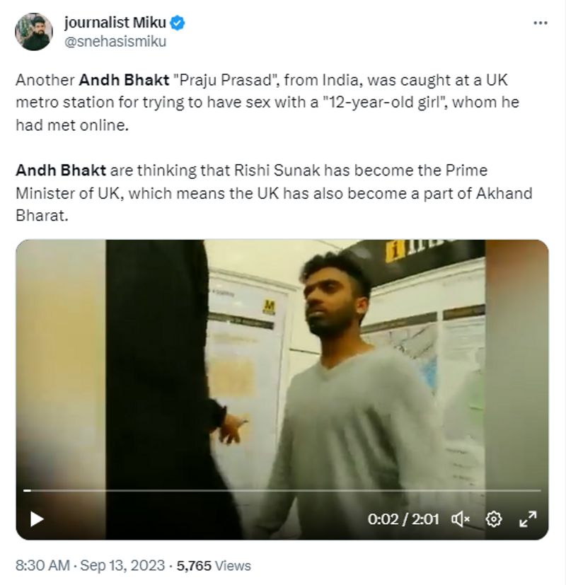 'ഓണ്ലൈന് വഴി പരിചയപ്പെട്ട 12 വയസ് മാത്രമുള്ള പെണ്കുട്ടിയോട് ലൈംഗികബന്ധത്തിന് ശ്രമിച്ച ഇന്ത്യയില് നിന്നുള്ള പ്രജു പ്രസാദ് യുകെ മെട്രോയില് വച്ച് പിടിയിലായി. യുകെയിലെ പീഡോഫൈല് ഹണ്ടേഴ്സാണ് ഇയാളെ പിടികൂടിയത്' എന്നുമാണ് വീഡിയോ ഷെയര് ചെയ്തുകൊണ്ട് സുശീല് ഷിണ്ഡെ എന്നയാള് ട്വിറ്ററില് കുറിച്ചിരിക്കുന്നത്. പിടികൂടിയ പൊലീസുകാരോട് ഇയാള് കാലില് പിടിച്ച് മാപ്പിരക്കാന് ശ്രമിക്കുന്നതും വീഡിയോയിലുണ്ട്. 'ഇന്ത്യന് വംശജനായ റിഷി സുനക് യുകെ പ്രധാനമന്ത്രിയായതോടെ ചിലര് കരുതിയിരിക്കുന്നത് യുകെ അഖണ്ഡ ഭാരത്തിന്റെ ഭാഗമാണ്' എന്ന കുറിപ്പോടെ മറ്റൊരാളും വീഡിയോ പങ്കുവെച്ചിരിക്കുന്നത് കാണാം. ഇത്തരത്തില് നിരവധി പേര് വീഡിയോ ട്വീറ്റ് ചെയ്തിരിക്കുന്നത് എക്സില്(ട്വിറ്റര്) കാണാം.