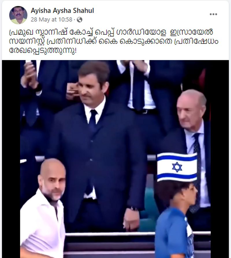 ഈ അവകാശവാദത്തോടെ വീഡിയോ ഫേസ്ബുക്കില് പലരും പോസ്റ്റ് ചെയ്തിട്ടുണ്ട്. 'പ്രമുഖ സ്പാനിഷ് കോച്ച് പെപ്പ് ഗാർഡിയോള ഇസ്രായേൽ സയനിസ്റ്റ് പ്രതിനിധിക്ക് കൈ കൊടുക്കാതെ പ്രതിഷേധം രേഖപ്പെടുത്തുന്നു!'- എന്ന് മലയാളത്തിലുള്ള കുറിപ്പുകളോടെയാണ് വീഡിയോ പോസ്റ്റ് ചെയ്തിരിക്കുന്നത്. പോസ്റ്റുകളുടെ ലിങ്കുകള് 1, 2, 3 എന്നിവയില് കാണാം.