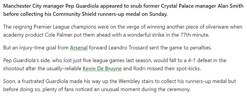 പെപ് ഗ്വാര്ഡിയോള ഹസ്തദാനം നല്കാതിരിക്കുന്നതായി വീഡിയോയില് കാണുന്നയാള് മറ്റൊരു ഇംഗ്ലീഷ് ക്ലബായ ക്രിസ്റ്റല് പാലസിന്റെ ക്ലബ് മുന് മാനേജര് അലന് സ്മിത്താണ്. മനപ്പൂര്വമോ അല്ലാതെയോ അലന് കൈകൊടുക്കാതെ പെപ് നടന്നുനീങ്ങിയതിനെ കുറിച്ച് ഇംഗ്ലീഷ് മാധ്യമമായ സ്പോര്ട്ബൈബിള് ഡോട് കോം 2023 ഓഗസ്റ്റ് ഏഴിന് പ്രസിദ്ധീകരിച്ച വാര്ത്തയുടെ സ്ക്രീന്ഷോട്ട് ചുവടെ ചേര്ക്കുന്നു. വൈറലായ വീഡിയോയില് നിന്നുള്ള സ്ക്രീന്ഷോട്ട് സ്പോര്ട്ബൈബിളിന്റെ വാര്ത്തയിലും കാണാം. 2023ലെ എഫ്എ കമ്മ്യൂണിറ്റി ഷീല്ഡ് ഫൈനലില് ആഴ്സണലിനോട് തോറ്റ ശേഷം റണ്ണറപ്പ് ട്രോഫി ഏറ്റുവാങ്ങാന് പെപ്പും സിറ്റി താരങ്ങളും പോകുന്നതില് നിന്നുള്ള വീഡിയോയാണിത് എന്ന് വാര്ത്തയില് വിശദീകരിക്കുന്നു.