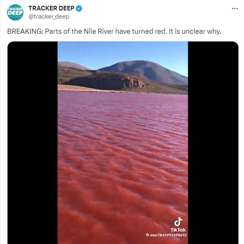 ബ്രേക്കിംഗ്- നൈല് നദിയുടെ ഭാഗങ്ങള് ചുവപ്പായി, എന്തുകൊണ്ടാണ് നദി ചുവന്നത് എന്ന് വ്യക്തമല്ല എന്ന കുറിപ്പോടെ 2023 നവംബര് 14ന് ട്രാക്കര് ഡീപ് എന്ന ട്വിറ്റര് ഹാന്ഡിലിലാണ് വീഡിയോ പ്രത്യക്ഷപ്പെട്ടത്. വീഡിയോയില് ടിക്ടോക്കിന്റെ ലോഗോയും കാണാം. ഇതിനകം ഒന്നരക്കോടിയിലധികം പേര് ഈ വീഡിയോ കണ്ടുകഴിഞ്ഞു. സത്യത്തില് വീഡിയോയില് കാണുന്നത് പോലെ ചുവന്നുതുടുത്ത നദി നൈല് തന്നെയോ? പരിശോധിക്കാം.