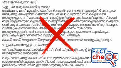 കേരളത്തില് താപനില 45°C മുതൽ 55°C വരെ ഉയരാൻ സാധ്യതയുണ്ടെന്ന തരത്തില് സിവില് ഡിഫന്സ് വകുപ്പിന്റെ പേരില് പ്രചരിക്കുന്ന വാട്സ്ആപ്പ് സന്ദേശം വ്യാജമാണ്. സിവില് ഡിഫന്സ് വകുപ്പ് എന്നൊരു വകുപ്പ് കേന്ദ്ര സര്ക്കാരിനോ സംസ്ഥാന സര്ക്കാരിനോ ഇല്ല എന്നതാണ് ഒരു യാഥാര്ഥ്യം. സംസ്ഥാനത്ത് താപനില 45°C മുതൽ 55°C വരെ ഉയരുമെന്ന തരത്തില് ഒരു മുന്നറിയിപ്പും കേന്ദ്ര കാലാവസ്ഥാ വകുപ്പ് പുറത്തിറക്കിയിട്ടില്ല എന്നതാണ് മറ്റൊരു വസ്തുത. സംസ്ഥാനത്ത് സാധാരണയായി ഇത്രയേറെ ഉയര്ന്ന താപനില രേഖപ്പെടുത്താറില്ല എന്നതുകൊണ്ടുതന്നെ ആരും ഈ വൈറല് വാട്സ്ആപ്പ് ഫോര്വേഡ് വിശ്വസിച്ച് ആശങ്കയിലാവേണ്ടതില്ല. സിവിൽ ഡിഫൻസ് വകുപ്പ് പുറത്തിറക്കിയ മുന്നറിയിപ്പ് എന്ന തരത്തിലുള്ള വാട്സ്ആപ്പ് മെസേജ് വ്യാജമാണെന്നും, മുന് വര്ഷങ്ങളിലും ഇതേ വാട്സ്ആപ്പ് ഫോര്വേഡ് തെറ്റായി പ്രചരിച്ചിരുന്നതാണെന്നും സംസ്ഥാന ദുരന്ത നിവാരണ അതോറിറ്റിയിലെ കാലാവസ്ഥാ വിദഗ്ധനായ രാജീവന് എരിക്കുളം ഏഷ്യാനെറ്റ് ന്യൂസ് ഓണ്ലൈനിനോട് പറഞ്ഞു.