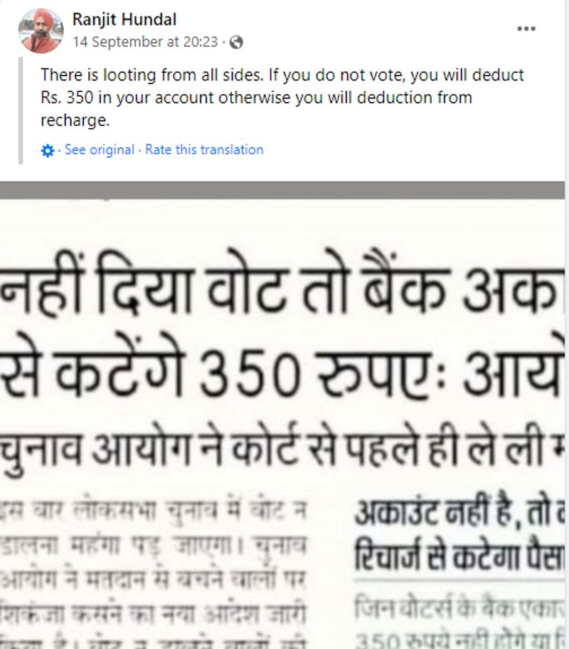 തെരഞ്ഞെടുപ്പ് കാലം ഇന്ത്യയില് വ്യാജ വാര്ത്തകളുടെ കുത്തൊഴുക്ക് കാലമാണ്. 2019ലെ ലോക്സഭാ തെരഞ്ഞെടുപ്പ് വേളയില് നൂറുകണക്കിന് വ്യാജ പ്രചാരണങ്ങളും വാര്ത്തകളുമാണ് പടര്ന്നത്. ഇത്തവണ ഇലക്ഷന് പ്രഖ്യാപിക്കും മുമ്പുതന്നെ വ്യാജ പ്രചാരണം ആരംഭിച്ചിരിക്കുകയാണ്. ലോക്സഭാ തെരഞ്ഞെടുപ്പില് വോട്ട് ചെയ്തില്ലെങ്കില് നിങ്ങളുടെ ബാങ്ക് അക്കൗണ്ടില് നിന്ന് 350 രൂപ പിന്വലിക്കപ്പെടും എന്നാണ് ഈ പ്രചാരണം. 'എല്ലാ ഭാഗത്ത് നിന്ന് കൊള്ളയാണ്. നിങ്ങള് വോട്ട് ചെയ്തില്ലെങ്കില് നിങ്ങളുടെ ബാങ്ക് അക്കൗണ്ടില് നിന്ന് 350 രൂപ പിടിക്കും. അതല്ലെങ്കില് റിച്ചാര്ജില് നിന്ന് ഈ തുക പിഴയായി ഈടാക്കും' എന്നുമാണ് രഞ്ജിത് ഹണ്ടാല് എന്നയാളുടെ ഫേസ്ബുക്ക് പോസ്റ്റ്. എന്താണ് ഇതിന്റെ വസ്തുത എന്ന് നോക്കാം.