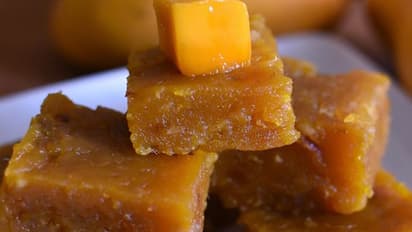 വെള്ളം വറ്റി തുടങ്ങുമ്പോള് നെയ്യ് ചേര്ക്കുക. വറ്റാൻ തുടങ്ങുമ്പോൾ താഴേയിറക്കി വയ്ക്കുക. ശേഷം ഒരു പരന്ന തട്ടത്തിൽ നെയ്യ് പുരട്ടി അതിലേക്ക് വറ്റിച്ച് വച്ചിരിക്കുന്ന മാമ്പഴ മിശ്രിതം പരത്തിവയ്ക്കുക. മുകളില് അണ്ടിപ്പരിപ്പും മുന്തിരിയും വിതറാം. തണുത്ത ശേഷം മുറിച്ച് കഴിക്കാവുന്നതാണ്.