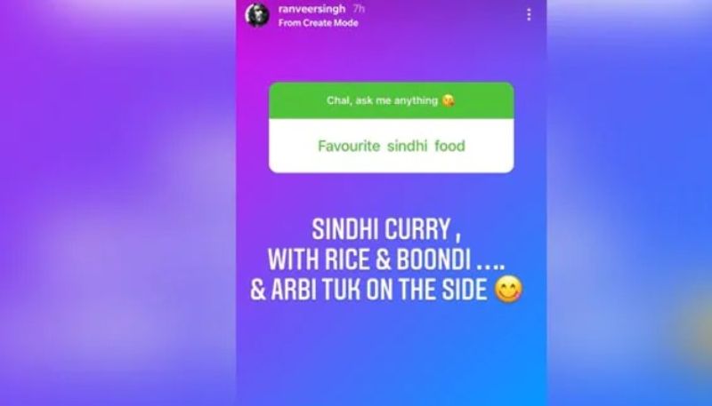 കഴിഞ്ഞ ദിവസം തന്റെ ആരാധകര്ക്കായി ഇന്സ്റ്റഗ്രാമിലൂടെ ചോദ്യങ്ങള് ചോദിക്കുന്നതിനുള്ള അവസരം താരം നല്കിയിരുന്നു. ഇഷ്ടപ്പെട്ട സിന്ധി ഭക്ഷണം ഏതാണെന്നായിരുന്നു ഒരു ആരാധകന്റെ ചോദ്യം. ഇതിന് രണ്വീര് നല്കിയ ഉത്തരമാണ് ഇപ്പോള് ഇന്സ്റ്റഗ്രാമില് ചര്ച്ചയാകുന്നത്.