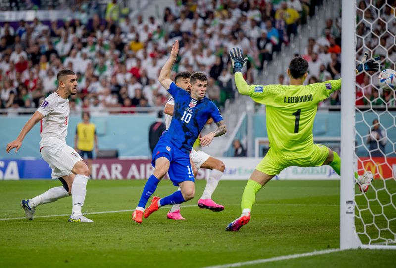 വാശിയേറിയ മറ്റൊരു പോരാട്ടത്തില് ഇറാന്റെ വെല്ലുവിളി അതിജീവിച്ചാണ് അമേരിക്ക പ്രീ ക്വാര്ട്ടറിലെത്തിയത്. തുടക്കത്തില് ഇരു ടീമുകളും ഒപ്പത്തിനൊപ്പം പോരാടി. മൂന്നാം മിനിറ്റില് യുഎസ് ബോക്സിന് പുറത്ത് ഇറാന് അനുകൂലമായി ഫ്രീ കിക്ക് ലഭിച്ചെങ്കിലും അപകടമൊഴിവാക്കി യുഎസ് രക്ഷപ്പെട്ടു.പതിനാറാം മിനിറ്റില് ഇറാന് ഗോള് കീപ്പറുടെ മികവ് തിമോത്തി വിയക്ക് ഉറപ്പായൊരു ഗോള് നിഷേധിച്ചു. ആദ്യ 20 മിനിറ്റില്ആക്രമണങ്ങള് നയിച്ചത് യുഎസ് ആയിരുന്നെങ്കിലും ഫിനിഷിംഗിലെ പോരായ്മ അവര്ക്ക് തിരിച്ചടിയായി.21-ാം മിനിറ്റില് മുന്നിലെത്താന് ഇറാന് അവസരം ലഭിച്ചെങ്കിലും അസമൗണിന്റെ ഉറച്ച ഗോളവസരം ടിം റീം നിഷ്ഫലമാക്കി.