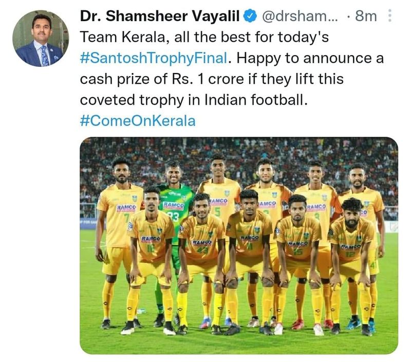 ടീമിന്റെ ഇതുവരെയുള്ള മികച്ച പ്രകടനത്തിനുള്ള അഭിനന്ദനമായും കിരീടം ചൂടാനുള്ള പ്രോത്സാഹനമായുമാണ് തന്റെ പ്രഖ്യാപനമെന്ന് ഡോ. ഷംഷീര് വയലില് ട്വിറ്ററില് കുറിച്ചു. മലയാളിയെന്ന നിലയില് കേരള ടീം ഫൈനലില് എത്തിയതില് അഭിമാനമുണ്ടെന്നും സംസ്ഥാന ഫുട്ബോള് രംഗത്തിന് ആവേശം പകരുന്നതാണ് ടീമിന്റെ മികച്ച പ്രകടനമെന്നും അദ്ദേഹം പറഞ്ഞു. കേരളം വിജയികളായാല് കിരീടദാന ചടങ്ങില് തന്നെ സമ്മാനത്തുക കൈമാറിയേക്കും.