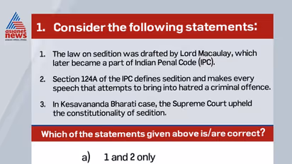 Statement 2 is correct: Section 124A of the IPC defines sedition and makes every speech or expression that “brings or attempts to bring into hatred or contempt, or excites or attempts to excite disaffection towards the Government established by law in India” a criminal offense punishable with a maximum sentence of life imprisonment.