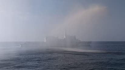 ഇന്ത്യൻ കോസ്റ്റ് ഗാർഡ് ഷിപ് സാരഥി ഉൾകടലിൽ ബോട്ടുകൾക്ക് അഗ്നിബാധയോ മറ്റൊ ഉണ്ടായാൽ വെള്ളം ഒഴിക്കുന്നത് ഇങ്ങനെയാണ്. (ഐഎൻഎസ് സുനയന)