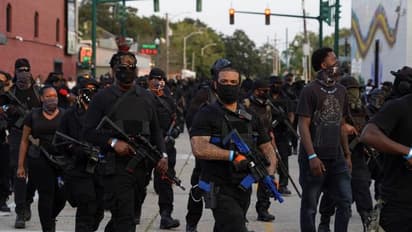 മാര്‍ച്ചിനിടെ തോക്ക് താഴേക്ക് ചൂണ്ടി ജോര്‍ജ് ഫ്ലോയിഡിന് ആദരമര്‍പ്പിച്ച് ഇടയ്ക്കിടയ്ക്ക് സംഘാംഗങ്ങള്‍ റോഡില്‍ മുട്ട് കുത്തി നിന്നു.