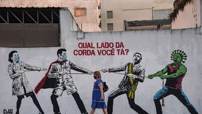 നിങ്ങള് ഏത് പക്ഷത്ത് ? എന്ന ചോദ്യമാണ് ഗ്രാഫിറ്റി ചിത്രകാരന് ചോദിക്കുന്നത്. കൊവിഡിന് കൂടെയോ ആരോഗ്യപ്രവര്ത്തകര്ക്കൊപ്പമോ ? പ്രസിഡന്റ് ബോൾസോനാരോ കൊവിഡ് 19 വയറസിനൊപ്പം ചേര്ന്ന് വടംവലിക്കുമ്പോള് ഡോക്ടര്മാരും നേഴ്സുമാരുമടങ്ങുന്ന ആരോഗ്യപ്രവര്ത്തകര് മറുപക്ഷം നിന്ന് വലിക്കുന്നു. വലിക്കുന്ന വടത്തിന് ഒത്ത നടുക്കുകൂടി ഒരു സ്ത്രീ നടന്നു പോകുന്ന ചിത്രം പകര്ത്തിയത് എഎഫ്പി ഫോട്ടോഗ്രാഫറായ നെല്സണ് എല്മീഡിയയാണ്. (ഗെറ്റി)