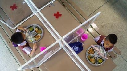 തായ്‌ലൻഡിലെ ബാങ്കോക്കിൽ രാജ്യവ്യാപകമായി സ്കൂളുകൾ പുനരാരംഭിച്ച ശേഷം വിചുത്തിറ്റ് സ്കൂളിലെ കിന്‍റർഗാർട്ടൻ വിദ്യാർത്ഥികൾ ഉച്ചഭക്ഷണം കഴിക്കുന്നു.