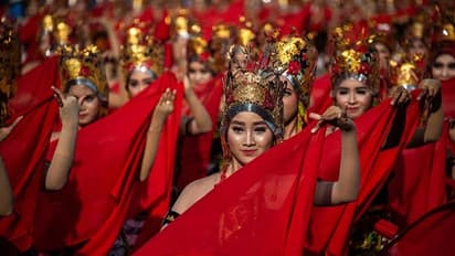 പരമ്പരാഗത വസ്ത്രധാരണത്തിൽ നർത്തകി ഒരു ഷാൾ, അലങ്കാര ശിരോവസ്ത്രം എന്നിവ ധരിക്കുന്നു.