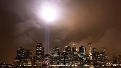 ന്യൂയോര്‍ക്കിലെ 9/11 സ്മാരകത്തിലും മ്യൂസിയത്തിലും ഇത്തവണ ദീപം തെളിയില്ല. ലൈറ്റുകള്‍ തെളിക്കേണ്ട ജീവനക്കാര്‍ക്ക് കൊവിഡ് സാധ്യതയുണ്ടെന്ന് കണക്കിലെടുത്താണ് തീരുമാനം. ചിത്രം - ആദരവായി മാന്‍ഹട്ടണ്‍ സ്‌കൈലൈനില്‍ ലൈറ്റ് തെളിഞ്ഞപ്പോള്‍