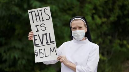 ക്വിൻസി ഹൊവാർഡ് എന്ന കന്യാസ്ത്രീ ട്രംപിന്റെ പള്ളിയിലേക്കുള്ള വാഹന വ്യൂഹം കടന്ന പോകുന്ന ‌വഴിയിൽ പ്ലക്കാർഡുമായി പ്രതിഷേധിക്കുന്നു