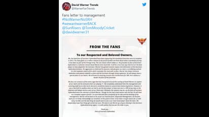 അടുത്ത സീസണ് ഐപിഎല് ഇന്ത്യയിലേക്ക് മടങ്ങിയെത്തിയാല് ഹോം ഗ്രൗണ്ടില് സണ്റൈസേഴ്സ് കുപ്പായത്തില് വാര്ണറെ എത്തിക്കാനുള്ള പദ്ധതികളാണ് ആരാധകര് ഒരുക്കുന്നത്.
