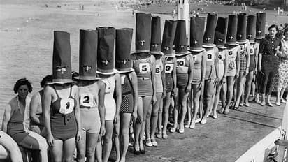 റിട്ട പെർചെറ്റിയും ഗ്ലോറിയ റോസിയും അവരുടെ പുതിയ പോർട്ടബിൾ ബാത്ത്ഹൗസ് പരീക്ഷിക്കുന്നു. സൺബത്ത് ചെയ്ത ശേഷം ഇതിനുള്ളിൽ വച്ച് വസ്ത്രങ്ങൾ മാറ്റാൻ കഴിയും എന്നതാണ് പ്രത്യേകത. 1938ൽ കോണി ഐലന്റ് ബീച്ചിൽ നിന്നും പകർത്തിയ ചിത്രം.