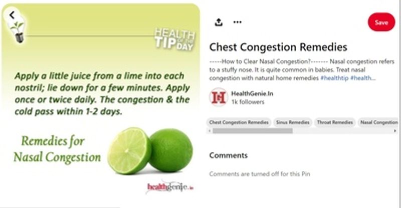 സൈനസൈറ്റിസ് ഇല്ലാതാക്കാൻ ചെറുനാരങ്ങയ്ക്ക് കഴിയുമെന്ന പോസ്റ്റർ Pinterest ൽ ആണ് ആദ്യം പ്രത്യക്ഷപ്പെട്ടത്. പിന്നീട് ഇത് സമൂഹമാധ്യമങ്ങളില് വൈറലാവുകയായിരുന്നു. " ഇന്നത്തെ ആരോഗ്യ ടിപ്പ്" എന്ന കുറിപ്പോടെയുള്ള പോസ്റ്റർ Healthgenje.in എന്ന വെബ്സൈറ്റിലും പ്രത്യക്ഷപ്പെട്ടു. സൈനസൈറ്റസ് മാറാനായി ഓരോ നാസദ്വാരത്തിലൂടെയും ചെറിയ അളവിൽ നാരങ്ങ നീര് ഇറ്റിച്ച് കുറച്ച് മിനിറ്റ് സമയം കിടക്കുക. ഇത് ദിവസത്തിൽ ഒന്നോ രണ്ടോ തവണ ആവർത്തിക്കണം. ഇങ്ങനെ ചെയ്താൽ 1-2 ദിവസത്തിനുള്ളിൽ ജലദോഷ ലക്ഷണങ്ങളിൽ നിന്ന് ആശ്വാസം നൽകുകയും സൈനസൈറ്റിസ് ഇല്ലാതാവുമെന്നും പോസ്റ്ററിൽ പറയുന്നു.