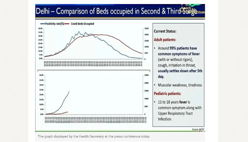 എന്തായാലും ഒമിക്രോണ് മൂലമുണ്ടായ മൂന്നാം തരംഗം രണ്ടാം തരംഗത്തെ അപേക്ഷിച്ച് അല്പം കൂടി ആശ്വാസകരമായ സാഹചര്യമാണുണ്ടാക്കുന്നതെന്നാണ് സര്ക്കാര് വൃത്തങ്ങളറിയിക്കുന്നത്. കൊവിഡ് പൊസിറ്റിവിറ്റി നിരക്കും ആശുപത്രികളില് എത്രമാത്രം കിടക്കകള് ഉപയോഗിക്കപ്പെട്ടുവെന്നതിന്റെ കണക്കും വച്ചുകൊണ്ടുള്ള ഗ്രാഫ് പങ്കുവച്ച് ഹെല്ത്ത് സെക്രട്ടറി രാജേഷ് ഭൂഷണ് ആണ് ഇക്കാര്യം അറിയിച്ചത്.