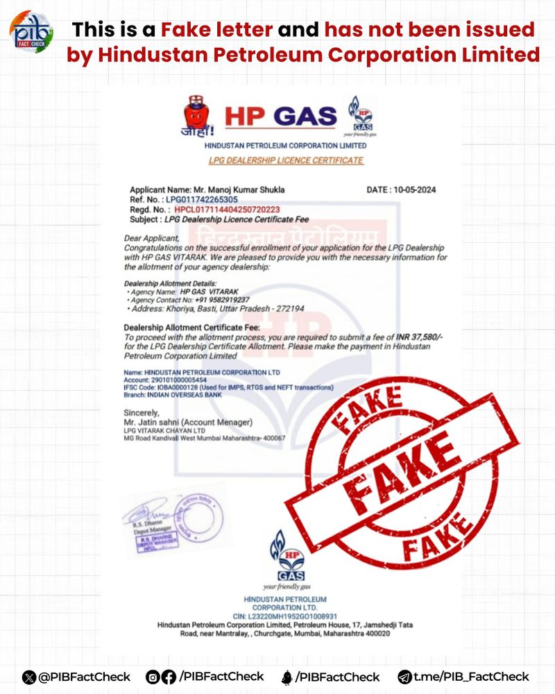 എന്നാല് ഹിന്ദുസ്ഥാന് പെട്രോളിയം പുറത്തിറക്കിയ കത്ത് എന്ന പേരില് പ്രചരിക്കുന്നത് വ്യാജ ലെറ്ററാണ് എന്നതാണ് വസ്തുത. എച്ച്പി ഇത്തരമൊരു കത്ത് ആര്ക്കും അയച്ചിട്ടില്ല. കേന്ദ്ര സര്ക്കാരിന് കീഴിലുള്ള പ്രസ് ഇന്ഫര്മേഷന് ബ്യൂറോയുടെ ഫാക്ട് ചെക്ക് വിഭാഗമാണ് ഇക്കാര്യം അറിയിച്ചത്. ഇത് വ്യാജ കത്താണ് എന്നതിനാല് ആരും പണമടച്ച് വഞ്ചിതരാവരുത്. എല്പിജി ഡീലര്ഷിപ്പുമായി ബന്ധപ്പെട്ട ഔദ്യോഗിക വിവരങ്ങള്ക്ക് www.lpgvitarakchayan.in എന്ന വെബ്സൈറ്റ് സന്ദര്ശിക്കണമെന്ന് പിഐബി അഭ്യര്ഥിച്ചു. ഹിന്ദുസ്ഥാന് പെട്രോളിയത്തിന്റെ പേരില് സമാനമായ കത്ത് മുമ്പും സോഷ്യല് മീഡിയയില് പ്രചരിച്ചിരുന്നു. അന്ന് എച്ച്പി തന്നെ പൊതുജനങ്ങള്ക്ക് മുന്നറിയിപ്പ് നല്കിയതാണ്.