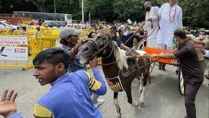 ബെംഗളുരു: ഇന്ധനവില വര്ധനവില് (Fuel Price Hike) പ്രതിഷേധിച്ച് കര്ണാടക(Karnataka) നിയമസഭയിലേക്ക് കുതിരവണ്ടിയിലെത്തി കോണ്ഗ്രസ് (Congress) നേതാക്കള്. പ്രതിപക്ഷ നേതാവ് സിദ്ധരാമയ്യ, കര്ണാടക കോണ്ഗ്രസ് അധ്യക്ഷന് ഡി കെ ശിവകുമാര് അടക്കം മുഴുവന് കോണ്ഗ്രസ് അംഗങ്ങളും കുതിരവണ്ടിയിലാണ് സഭയിലെത്തിയത്. ഇന്ധനവില ജിഎസ്ടി പരിധിയിലാക്കണമെന്ന് കോണ്ഗ്രസ് ആവശ്യപ്പെട്ടു. തമിഴ്നാട് മാതൃകയില് നികുതി കുറയ്ക്കാന് കര്ണാടക സര്ക്കാര് തയാറാകണമെന്നും സഭയില് കോണ്ഗ്രസ് ചൂണ്ടികാട്ടി.