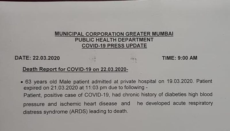 മുംബൈ: മഹാരാഷ്ട്രയിൽ ഒരാൾ കൂടി കൊവിഡ് ബാധിച്ച് മരിച്ചു. 63 കാരനാണ് രോഗം ബാധിച്ച് മരിച്ചത്. ഇന്നലെ രാത്രി 11 മണിക്കാണ് മരണം സംഭവിച്ചതെന്ന് മുംബൈ മുൻസിപ്പിൽ കോർപ്പറേഷൻ ആരോഗ്യ വിഭാഗം പുറത്തിറക്കിയ വാർതത്താക്കുറിപ്പിൽ പറയുന്നു. എച്ച് എൻ റിലയൻസ് ആശുപത്രിയിൽ ചികിത്സയിലായിരുന്നു ഇയാൾ. ഇയാൾക്ക് പ്രമേഹവും ഉയർന്ന രക്തസമ്മർദ്ദവും ഉണ്ടായിരുന്നു.