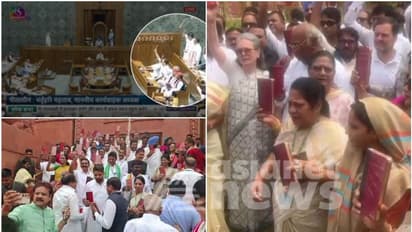 പാർലമെന്റ് വളപ്പ് ഗാന്ധി പ്രതിമയിരുന്ന സ്ഥലത്തുനിന്നാണ് വലിയ ഊർജത്തോടെ പ്രതിപക്ഷം സഭയിലേക്ക് കയറിയത്. സോണിയ ഗാന്ധിയുടെയും രാഹുൽ ഗാന്ധിയുടെയും നേതൃത്ത്വത്തിൽ ഭരണഘടനയുടെ ചെറിയ പതിപ്പ് കൈയിൽ പിടിച്ചായിരുന്നു പ്രതിപക്ഷ നീക്കം. കോൺഗ്രസിന്റെ നിർദേശം ഇന്ത്യ സഖ്യനേതാക്കളും അംഗീകരിക്കുകയായിരുന്നു. കേരളത്തിൽ നിന്നുള്ള കെ രാധാകൃഷ്ണൻ ഉൾപ്പടെ എല്ലാം അംഗങ്ങളും ഇതിൽ പങ്കുചേർന്നു. പിന്നീട് സഭയ്ക്കുള്ളിലും പ്രതിപക്ഷം ഭരണഘടന ഉയർത്തിയുള്ള പ്രതിഷേധം തുടർന്നു.