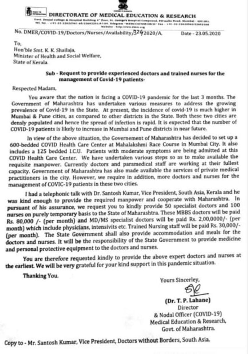 എംബിബിഎസ് ഡോക്ടര്മാര്ക്ക് മാസം 80,000 രൂപയും എംഡി/എംഎസ് സ്പെഷ്യലിസ്റ്റുകള്ക്ക് രണ്ട് ലക്ഷം രൂപയും നഴ്സുമാര്ക്ക് 30,000 രൂപയും പ്രതിമാസം നല്കുമെന്നും മഹാരാഷ്ട്ര അറിയിച്ചിട്ടുണ്ട്. ഇവരുടെ താമസവും ഭക്ഷണവും മരുന്നും പിപിഇ കിറ്റ് അടക്കമുള്ള ഉപകരണങ്ങളും മഹാരാഷ്ട്ര സര്ക്കാര് ഒരുക്കും.