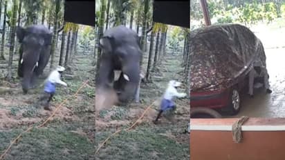തോട്ടത്തില് ജോലി ചെയ്യുകയായിരുന്ന രണ്ടു തൊഴിലാളികളുടെ സമീപത്തേക്കാണ് കാട്ടാന പാഞ്ഞു വന്ന് ആക്രമിക്കാന് ശ്രമിച്ചത്. ആനയെ കണ്ടതോടെ ഇരുവരും ഓടി രക്ഷപ്പെടാന് ശ്രമിച്ചു. ഇവരില് ഒരാള് ആനയുടെ തൊട്ടു മുന്നില്പ്പെട്ടെങ്കിലും തലനാരിഴയ്ക്കാണ് രക്ഷപ്പെട്ടത്. തുടര്ന്ന് ഇയാള് സമീപത്തെ വീട്ടിലേക്ക് ഓടി കയറാന് ശ്രമിച്ചെങ്കിലും പൂട്ടിയിട്ട നിലയിലായിരുന്നു. ഇതോടെ മുറ്റത്ത് പാര്ക്ക് ചെയ്ത കാറിന്റെ അടിയിലേക്ക് കയറുന്നതും വീഡിയോയില് കാണാം.