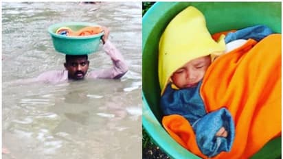 കുഞ്ഞിനെ കൈയിലെടുത്ത് വരാന് സാധിക്കുമായിരുന്നില്ല. അങ്ങനെ ഒരു പ്ലാസ്റ്റിക് പാത്രത്തില് കുഞ്ഞിനെ കിടത്തി കയറില് പിടിച്ച് ഇക്കരയെത്തിച്ചുവെന്ന് സബ് ഇന്സ്പെക്ടര് പറഞ്ഞു. പ്ലാസ്റ്റിക് പാത്രത്തില് തുണികള് വെച്ചാണ് കുഞ്ഞിനെ കിടത്തിയത്. ഏകദേശം ഒന്നര കിലോമീറ്റര് നടന്നാണ് കുഞ്ഞിനെയും അമ്മയെയും സുരക്ഷിത സ്ഥലത്തേക്ക് മാറ്റിയത്. കേരളത്തിലും പ്രളയകാലത്ത് സമാനമായ സംഭവമുണ്ടായിരുന്നു. ഇടുക്കി ഡാം തുറന്ന് ചെറുതോണി പാലത്തിന് മുകളില് വെള്ളം കയറുന്നതിന് നിമിഷങ്ങള് മുമ്പ് കുഞ്ഞിനെ ഇക്കരെയെത്തിച്ച ഉദ്യോഗസ്ഥന്റെ ധൈര്യത്തെയും ലോകം പുകഴ്ത്തിയിരുന്നു.