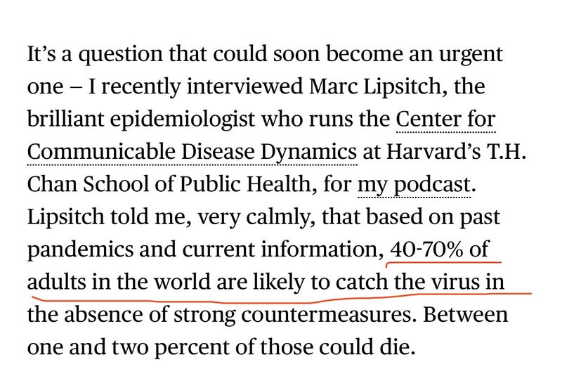 ശക്തമായ പ്രതിരോധ നടപടികള് സ്വീകരിച്ചില്ലെങ്കില് ലോകത്തിലെ മൊത്തം ജനസംഖ്യയില് 40-70 ശതമാനം ആളുകള്ക്ക് രോഗബാധ ഉണ്ടാകാന് സാധ്യതയുണ്ടെന്നും ഇതില് ഒന്നു മുതല് രണ്ടു ശതമാനം വരെ ആളുകള്ക്ക് രോഗം മൂലം ജീവന് നഷ്ടപ്പെടാമെന്നുമാണ് ലിപ്സിച് പറയുന്നത്. ഇതിനോട് സമാനമായ കണ്ടെത്തലുകളാണ് ബയോസ്റ്റാറ്റിസ്റ്റീഷ്യനും വേള്ഡ് ഹെല്ത്ത് ഓര്ഗനൈസേഷന്(ഡബ്ല്യുഎച്ച്ഒ) ഉപദേശകയുമായ ഇറ ലോങിനി പങ്കുവെച്ചത്. ലോകജനസംഖ്യയില് മൂന്നില് രണ്ടു ഭാഗം ആളുകള്ക്ക് കൊവിഡ് 19 ബാധിക്കുമെന്നാണ് ഇറയുടെ പ്രവചനം.