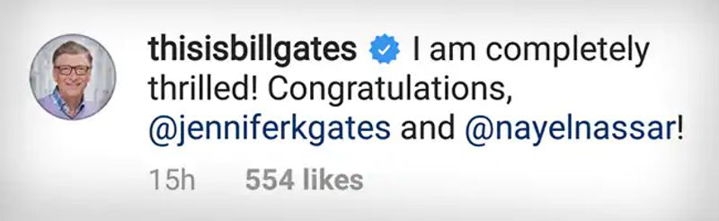 നിരവധി പേരാണ് ജെന്നിഫറിനും നയേലിനും ആശംസകളറിയിച്ച് എത്തിയത്. എന്നാൽ, ഇതിൽനിന്നെല്ലാം വളരെ വ്യത്യസ്തമായിട്ടായിരുന്നു ബില് ഗേറ്റ്സ് തന്റെ മൂത്തമകളായ ജെന്നിഫറിന് ആശംസകളറിയിച്ചത്. ''ഞാന് വളരെയധികം ആവേശത്തിലാണ്, അഭിനന്ദനങ്ങള്', എന്നായിരുന്നു ജെന്നിഫറിന്റെ പോസ്റ്റിന് താഴെയായി ബില് ഗേറ്റ്സ് കുറിച്ചത്. ജെന്നിഫറിന്റെ അമ്മ മെലിന്ഡ ഗേറ്റ്സും ഇരുവരേയും അഭിനന്ദിച്ച് രംഗത്തെത്തിയിരുന്നു.