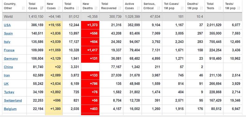 ലോകമാകെ മഹാമാരിയായി പടര്ന്ന കൊവിഡില് മരണസംഖ്യ ഉയരുന്നു. ആഗോളതലത്തില് മരണ സംഖ്യ 81000 കടന്നു. പതിനാല് ലക്ഷത്തിലധികം പേര്ക്കാണ് ലോകത്താകമാനായി രോഗം സ്ഥിരീകരിച്ചിട്ടുള്ളത്. മൂന്ന് ലക്ഷത്തിലധികം പേര്ക്ക് രോഗം ഭേദമായിട്ടുമുണ്ട്. ഫ്രാന്സ്, അമേരിക്ക, യുകെ, ഇറ്റലി, സ്പെയിന്, ബെല്ജിയം എന്നീ രാജ്യങ്ങളിലാണ് ഇന്ന് കൊവിഡ് അതിന്റെ ഭീകരത ഏറ്റവുധികം പ്രകടമാക്കിയിരിക്കുന്നത്.