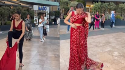വീഡിയോയിൽ, ചുവന്ന ബ്ലൗസും ലെഗ്ഗിൻസും ധരിച്ച് ഷോപ്പിംഗ് ബാഗുകളുമായി നിൽക്കുന്ന യുവതി സാരി ധരിക്കാൻ ഒരുങ്ങുന്നതാണ് കാണുന്നത്. ആദ്യം ബ്ലൗസും ലെഗിനും ധരിച്ചെത്തുന്ന യുവതി, പിന്നീട് സാരി ചുറ്റുന്ന ദൃശ്യങ്ങളാണ് വീഡിയോയിലുള്ളത്. ചിലര് ഇത് കണ്ട് കയ്യടിക്കുന്നത് ദൃശ്യങ്ങളിലുണ്ട്. മറ്റുചിലർ അന്തംവിട്ട് നോക്കി നിൽഖ്കുന്നതും, അതൃപ്തി പ്രകടിപ്പിക്കുന്നതും കാണാം.