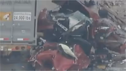 ചുവന്ന നിറത്തിലുള്ള സെമിട്രെക്ക് ദേശീയ പാതയിൽ മുന്നിലുള്ള എട്ടിലേറെ വാഹനങ്ങളിലേക്ക് ഇടിച്ച് കയറുന്ന ദൃശ്യങ്ങൾ പുറത്ത് വന്നിട്ടുണ്ട്. എസ്യുവിൽ ഇടിച്ചതിന് പിന്നാലെ വലിയ രീതിയിൽ തീയും മേഖലയിലുണ്ടായി. 21കാരൻ ഉപയോഗിച്ചിരുന്ന സെമിട്രെക്ക് പൂർണമായി കത്തിക്കരിഞ്ഞു പോയിരുന്നു. നാല് പേർക്കാണ് അപകടത്തിൽ പരിക്കേറ്റിട്ടുള്ളത്. പൊലീസ് പിടിയിലുള്ള 21കാരനെ ഐസിഇ ചുമത്തിയാണ് അറസ്റ്റ് ചെയ്തത്.