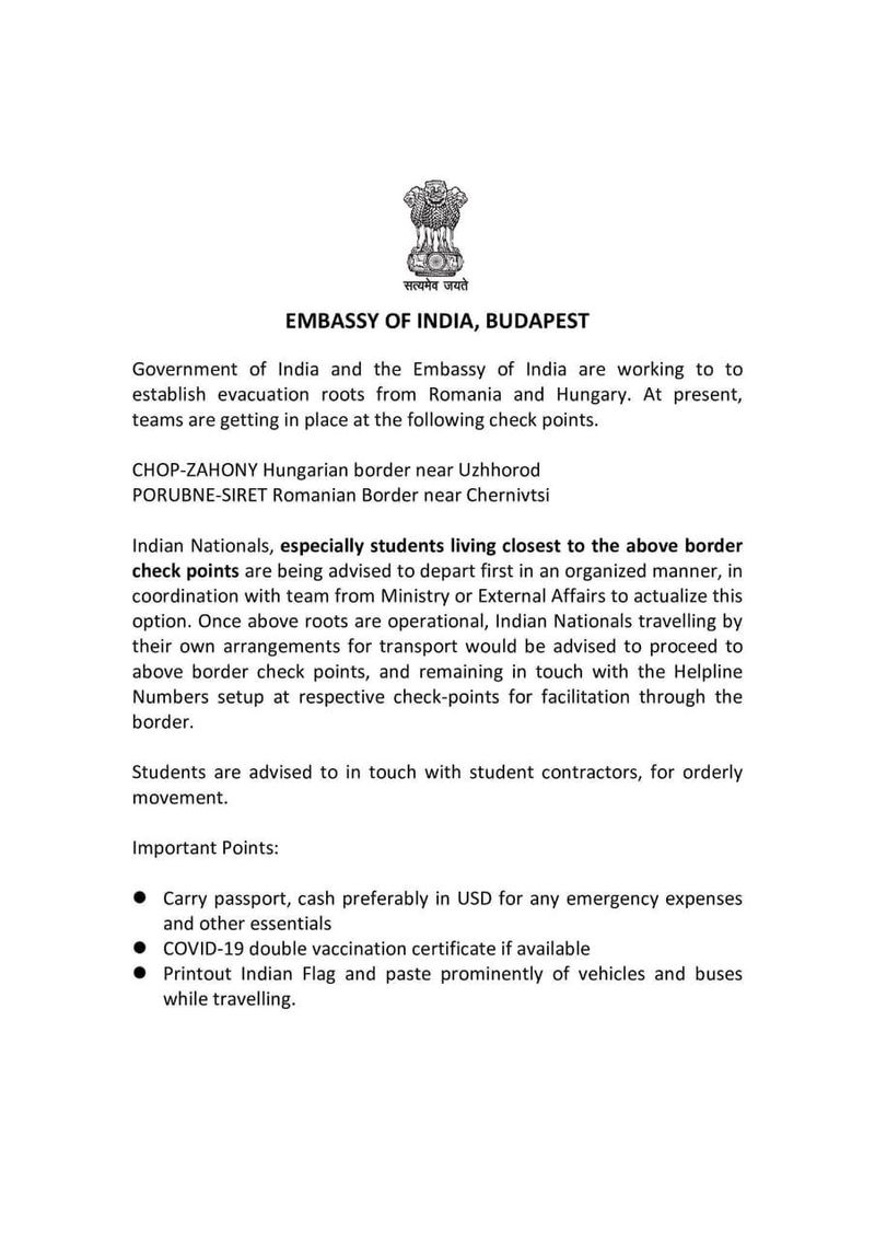 അതിർത്തികളിൽ എത്താനാണ് വിദ്യാർത്ഥികൾക്ക് അധികൃതർ നൽകുന്ന നിർദേശം. ഹംഗറി റൊമാനിയ അതിർത്തിയിൽ എത്താനാണ് നിലവിൽ നിർദേശം നൽകിയിരിക്കുന്നത്. അതിർത്തിക്കടുത്ത് താമസിക്കുന്നവർ ആദ്യം എത്തണം. സഹായം ആവശ്യമുള്ളവർ ഹെൽപ് ലൈൻ നമ്പറുകളിൽ വിളിക്കണം (ഹെൽപ് ലൈൻ നമ്പറുകൾ ഈ വാർത്തയുടെ ചുവടെ) അതിർത്തിയിലേക്ക് ചിട്ടയോടെ നീങ്ങണം. സ്റ്റുഡന്റ് കോൺട്രാക്റ്റർമാരെ ആവശ്യങ്ങൾക്ക് സമീപിക്കണം. പാസ്പോർട്ട് കയ്യിൽ കരുതണം. പണം യുഎസ് ഡോളറായി കരുതുന്നതാണ് നല്ലത്. കൊവിഡ് ഡബിൾ വാക്സിനേഷൻ സർട്ടിഫിക്കറ്റുണ്ടെങ്കിൽ അത് കയ്യിൽ കരുതണം. യാത്ര ചെയ്യുന്ന വാഹനത്തിൽ സ്വന്തം വസ്ത്രത്തിൽ എല്ലാം വളരെ വ്യക്തമായി, വലുപ്പത്തിൽ ഇന്ത്യൻ പതാക പിൻ ചെയ്യുകയോ ഒട്ടിക്കുകയോ ചെയ്യുക. സുരക്ഷ ഉറപ്പ് വരുത്താനാണിതെന്നും എംബസി അറിയിക്കുന്നു.