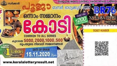 തിരുവനന്തപുരം: കേരള സംസ്ഥാന ഭാഗ്യക്കുറി വകുപ്പിന്റെ പൂജ ബമ്പർ (BR 76) ഭാഗ്യക്കുറിയുടെ നറുക്കെടുപ്പ് ഫലം പ്രഖ്യാപിച്ചു. ഇന്ന് ഉച്ച കഴിഞ്ഞ് 2 മണിക്കായിരുന്നു ഫലം പ്രഖ്യാപിച്ചത്. ഭാഗ്യക്കുറി വകുപ്പിന്റെ ഔദ്യോഗിക വെബ്സൈറ്റായ http://keralalotteries.com/ല് ഫലം ലഭ്യമാകും.