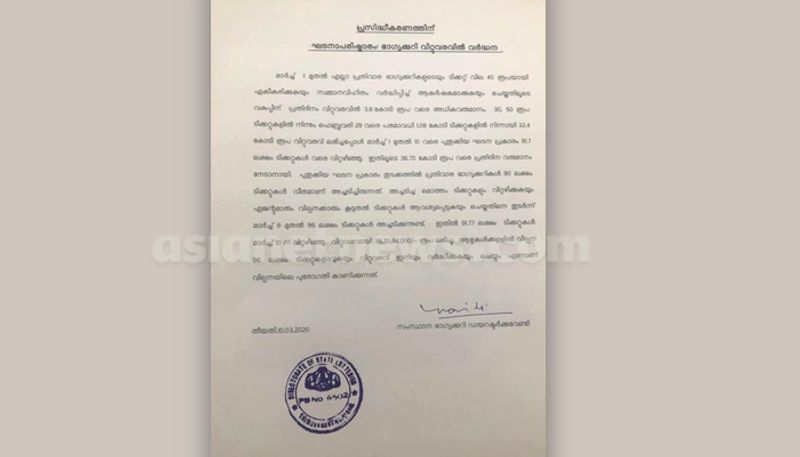 ഇതിൽ 91.77 ലക്ഷം ടിക്കറ്റുകൾ മാർച്ച് 10ന് വിറ്റഴിയുകും വിറ്റുവരവായി 36,70,84,000 രൂപ ലഭിക്കുകയും ചെയ്തു. ആഴ്ചകൾക്കുള്ളിൽ വില്പന 96 ലക്ഷം ടിക്കറ്റുകളാവുകയും വിറ്റുവരവ് ഇനിയും വർദ്ധിക്കുകയും ചെയ്യുമെന്നാണ് ലോട്ടറി വകുപ്പിന്റെ വിലയിരുത്തൽ.