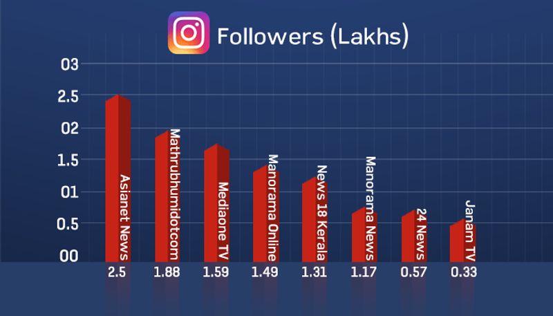 ഒപ്പം ഇന്സ്റ്റാഗ്രാമില് 2.5 ലക്ഷം ഫോളോവേഴ്സുമായി ബഹുദൂരം മുന്നിലാണ് ഏഷ്യാനെറ്റ് ന്യൂസ്. 1.88 ലക്ഷം ഫോളോവേഴ്സുമായി മാതൃഭൂമിഡോട്ട്കോം ആണ് രണ്ടാമത്. 1.59 ഫോളോവേഴ്സുമായി മീഡിയവണ് ടിവി മൂന്നാം സ്ഥാനത്താണ്. പുതിയതായി രംഗപ്രവേശം ചെയ്ത ഹലോ ആപ്പ്, ഷെയര്ചാറ്റ്, ടെലിഗ്രാം എന്നീ സോഷ്യല് മീഡിയാ പ്ലാറ്റ്ഫോമുകളിലും ഏഷ്യാനെറ്റ് ന്യൂസ് സജീവമാണ്.