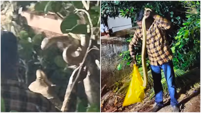 തിരുവനന്തപുരം: കോവളം കോളിയൂരിൽ മരത്തിൽ കയറിയ മൂർഖനെ മണിക്കൂറുകൾ നീണ്ട പരിശ്രമത്തിന് ഒടുവിൽ മരംമുറിച്ച് ചാക്കിലാക്കി. കോളിയൂർ സ്വദേശി ശിവപ്രകാശിന്റെ വീട്ടിലായിരുന്നു സംഭവം. വീട്ടിലെ നായയെ കണ്ടു ഭയന്ന മൂർഖൻ ഇന്നലെ വൈകുന്നേരം മൂന്ന് മണിയോടെ വീടിന് സമീപത്തെ പ്ലാവിലേക്ക് കയറുകയായിരുന്നു. ഇതു കണ്ട വീട്ടുകാർ പാമ്പ് പിടിത്തക്കാരനെ അറിയിച്ചു. ഇയാളെത്തിയെങ്കിലും ഉയരത്തിലുള്ള മരത്തിൽ മുകളിൽ കയറാൻ സാധിച്ചില്ല. പിന്നാലെ ഫയർഫോഴ്സിന്റെ സഹായം തേടി.