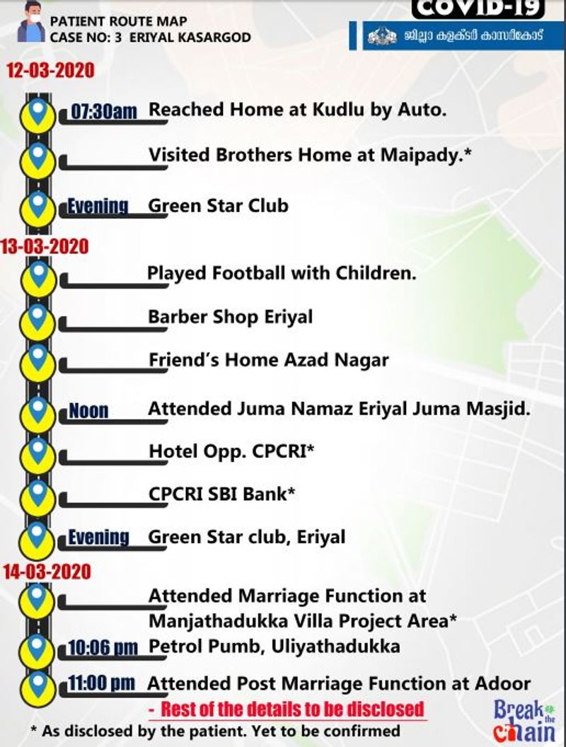 കാസർകോട് റെയിൽവേ സ്റ്റേഷനിലെത്തിയ ശേഷം ഓട്ടോയിൽ വീട്ടിലെത്തി. അടുത്ത ദിവസം രാവിലെ 7.30നാണ് ഇയാൾ വീട്ടിലെത്തിയത്. അതിന് ശേഷം മൈപ്പാടിയിലെ സഹോദരന്റെ വീട്ടിലേക്ക് പോയി, വൈകിട്ട് ഗ്രീൻ സ്റ്റാർ ക്ലബ്ബിൽ ചെന്നു.