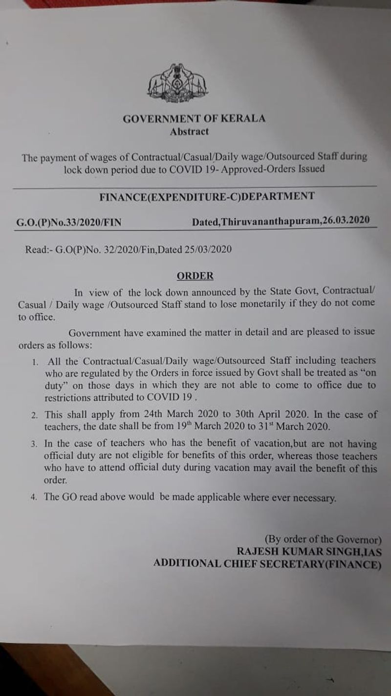 കരാർ ജീവനക്കാരുടെ മാർച്ച് 24 മുതൽ ഏപ്രിൽ 30 വരെയുള്ള സമയമാണ് ഡ്യൂട്ടിയായി കണക്കാക്കുന്നത്. കരാർ അധ്യാപകരുടെ മാർച്ച് 19 മുതൽ 30വരെയുളള ദിവസങ്ങളാണ് ഡ്യൂട്ടി ദിവസങ്ങളായി കണക്കാക്കുന്നത്. അതേ സമയം കൊവിഡ്- 19 പശ്ചാത്തലത്തിൽ സർക്കാർ തീരുമാനപ്രകാരം വിവിധ ക്ഷേമ പെൻഷനുകളുടെ വിതരണം ഇന്നു മുതൽ ആരംഭിച്ചു. 1300 കോടിരൂപയാണ് ആദ്യഘട്ട പെൻഷൻ വിതരണത്തിനായി വേണ്ടിവരുന്നത്.