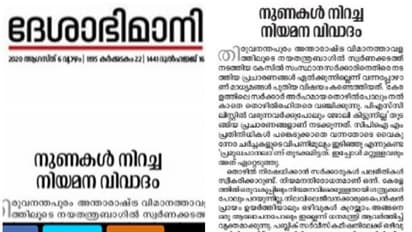 അതേസമയം, വിവാദമായ കരാർ നിയമനങ്ങളും പിൻവാതിൽ നിയമനങ്ങളും സംബന്ധിച്ച് ലേഖനത്തിൽ പരാമർശമില്ല. സിപിഎം പ്രതിനിധികൾ പങ്കെടുക്കാതെ വന്നതോടെ ചാനൽചർച്ചകളുടെ വിപണി മൂല്യം ഇടിഞ്ഞു എന്ന് തിരിച്ചറിഞ്ഞാണ് പ്രമുഖ ചാനലിന്റെ വാർത്താ പരമ്പരയെന്നും ദേശാഭിമാനി വിമർശിക്കുന്നു.