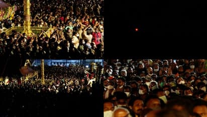 പത്തനംതിട്ട: കൊവിഡ് പ്രതിസന്ധിക്കിടയിലും മല കയറിയെത്തിയ ഭക്തസഹസ്രങ്ങൾക്ക് ആഹ്ളാദമേക്കി പൊന്നമ്പലമേട്ടിൽ മകരജ്യോതി പ്രഭ.... പന്തളം കൊട്ടാരത്തിൽ നിന്നും എത്തിച്ച ആഭരണങ്ങൾ അണിയിച്ച് അയ്യപ്പനുള്ള ദീപാരാധന തുടങ്ങിയതിന് തൊട്ടുപിന്നാലെയാണ് പൊന്നമ്പലമേട്ടിൽ മകരജ്യോതി തെളിഞ്ഞത്. മകരവിളക്ക് കണ്ടു തൊഴാനായി സന്നിധാനത്ത് 75,000-ത്തോളം ഭക്തരാണ് കാത്തുനിന്നത്. കൊവിഡ് കാലത്തെ ഏറ്റവും വലിയ ഭക്തജന സാന്നിധ്യമാണ് ഇന്ന് ശബരിമലയിൽ ദൃശ്യമായത്. തിരുവാഭരണപേടകം സന്നിധാനത്ത് എത്തിയതിന് പിന്നാലെ ആഭരണങ്ങൾ അയ്യപ്പനെ അണിയിച്ച് 6.47-നാണ് നട തുറന്നത്. അയ്യപ്പനുള്ള ദീപാരാധന കഴിഞ്ഞതിന് പിന്നാലെ പൊന്നമ്പലമേട്ടിൽ മൂന്ന് തവണയായി മകരജ്യോതി തെളിയുകയായിരുന്നു.