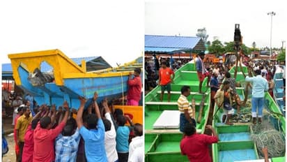 ക്രെയിന് എത്തുന്നതിന് മുന്പ് മത്സ്യത്തൊഴിലാളികള് സ്വന്തം ചുമലിലേറ്റിയാണ് വള്ളങ്ങള് ഉയര്ത്തി ലോറികളില് വച്ചത്.