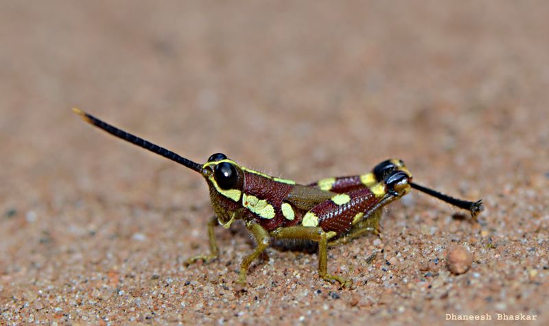 2016 ല് ഗവേഷണത്തിന്റെ ഭാഗമായി ലണ്ടനിലെ ബ്രിട്ടീഷ് നാച്ച്വറല് ഹിസ്റ്ററി മ്യൂസിയം സന്ദര്ശിച്ചപ്പോള് അവിടെ ഇന്ത്യയില് നിന്ന് അടക്കം കൊണ്ടുപോയി സൂക്ഷിച്ചിരിക്കുന്ന 100 വര്ഷത്തോളം പഴക്കമുള്ള ജീവികളുടെ 'ടൈപ്പ് സ്പെസിമെന്സ്' കാണാന് കഴിഞ്ഞു. നൂറ് കണക്കിന് സ്പെസിമെനില് നിന്നും രണ്ട് പുല്ച്ചാടികള് തന്റെ ശ്രദ്ധയാകര്ഷിച്ചെന്നും ധനീഷ് പറയുന്നു. Mopla guttata & Mopla rubra (Henry, 1940) എന്ന ശാസ്ത്ര നാമത്തിൽ കടും ചുവപ്പ് നിറത്തിൽ ശരീരം മുഴുവൻ സ്വർണ പുള്ളികൾ ഉള്ള രണ്ട് പുൽച്ചാടികളായിരുന്നു അവ. 1938 ൽ നെടുംകയം-നിലമ്പൂർ ഭാഗത്ത് നിന്നും കണ്ടെത്തിയ Mopla rubra യും , 1939 ൽ തമിഴ്നാട്ടിലെ ആനമല-ടോപ്സ്ലിപ്പിൽ ഭാഗത്ത് നിന്നും കണ്ടെത്തിയ Mopla guttata യുമായിരുന്നത്. രണ്ടും പെൺ പുൽച്ചാടികൾ ആയിരുന്നു.