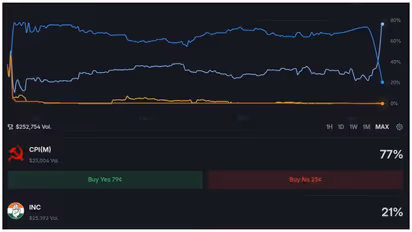 രാവിലെ വരെ വിജയസാധ്യതയിൽ മുന്നിലായിരുന്ന യുഡിഎഫിന്റെ ഗ്രാഫ് പെട്ടെന്ന് താഴേക്ക് പതിക്കുകയും എൽഡിഎഫിന്റെ സാധ്യത 80 ശതമാനത്തിലേക്ക് കുതിച്ചുയരുകയും ചെയ്തു. വോട്ടെടുപ്പ് പുരോഗമിക്കവെ ഉണ്ടായ ഈ 'ട്വിസ്റ്റ്' രാഷ്ട്രീയ നിരീക്ഷകരെയും ടെക് വിദഗ്ധരെയും ഒരുപോലെ അമ്പരപ്പിച്ചിരിക്കുകയാണ്. ക്രിപ്റ്റോ കറൻസിയിലൂടെ കോടീശ്വരനായ ഷെയ്ൻ കോപ്ലാൻ സ്ഥാപിച്ച പോളിമാർക്കറ്റ്, ലോകത്തെ പ്രധാന സംഭവങ്ങളിൽ പണം വെച്ച് പ്രവചനം നടത്താൻ സൗകര്യമൊരുക്കുന്ന പ്ലാറ്റ്ഫോമാണ്. ഡോണൾഡ് ട്രംപ് ജൂനിയർ, പീറ്റർ തീൽ തുടങ്ങിയ പ്രമുഖർക്ക് നിക്ഷേപമുള്ള ഈ പ്ലാറ്റ്ഫോം, അമേരിക്കൻ പ്രസിഡന്റ് തെരഞ്ഞെടുപ്പിലും ട്രംപിന്റെ വിജയം കൃത്യമായി പ്രവചിച്ചിരുന്നു. എന്നാൽ ഇത്തരത്തിലുള്ള ബെറ്റിംഗ് സൈറ്റുകൾ നിയമപരമായ തടസങ്ങളും കൃത്രിമത്വ ആരോപണങ്ങളും നേരിടുന്നുണ്ട്.