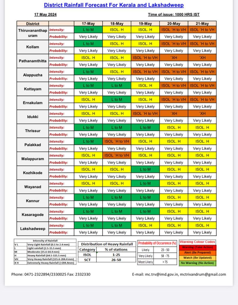 തിങ്കൾ, ചൊവ്വ ദിവസങ്ങളിൽ തിരുവനന്തപുരം മുതൽ ഇടുക്കി വരെ ഏഴ് ജില്ലകളിൽ ഓറഞ്ച് അലര്ട്ടും മറ്റ് ജില്ലകളിൽ യെല്ലോ അലര്ട്ടുമാണ്.