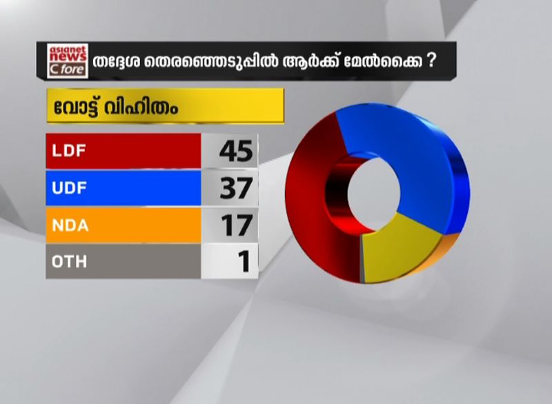 32 ശതമാനത്തിന്റെ പിന്തുണയാണ് യുഡിഎഫിന് കണക്കാക്കുന്നത്. വോട്ട് വിഹിതം 37 ശതമാനം. എൻഡിഎ 12 ശതമാനം പേരുടെ പിന്തുണ ഉറപ്പാക്കുമെന്ന് പറയുന്ന സര്വെയിൽ വോട്ട് വിഹിതം 17 ശതമാനമാണ്.